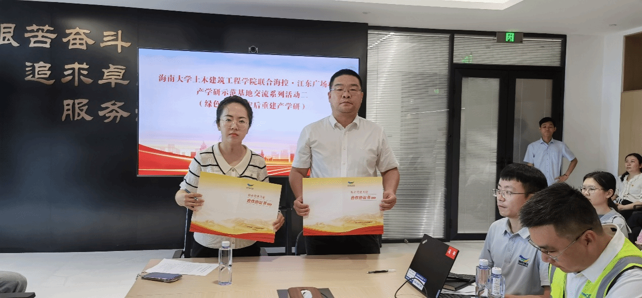 活动期间,海控•江东广场项目部联合db真人体育官网发起校企党建共建倡议。在DB视讯土木建筑工程公司党委书记李艳的授权下,公司第二党支部张亿先老师与海控城市运营集团代表共同签署《校企党建共建协议》,党员积极分子赵雁老师全程见证。未来,双方将依托党建联合发展基地,整合校企资源优势,在人才培养、技术攻关、绿色建筑标准研发等领域深化合作,齐心聚力打造产学研协同发展创新平台2.0版本,为自贸港建设输送更多复合型人才。