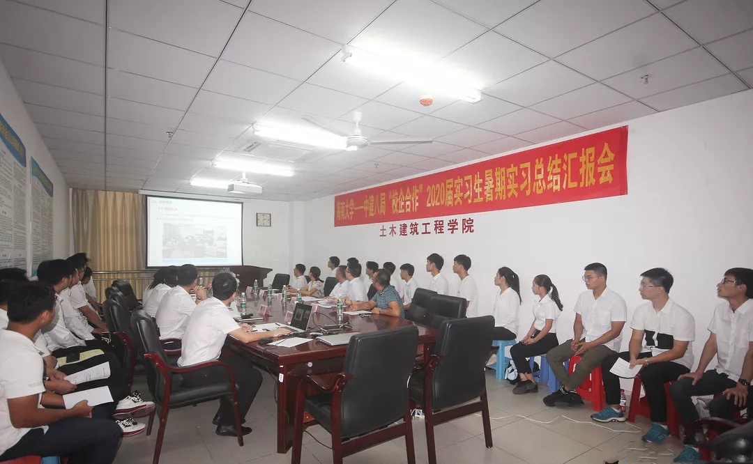 为进一步加强校企合作,提升合作内涵,充分发挥校外实习实践基地的平台作用,进而促进本科教学质量的提升,促进员工专业认知,提高专业实操技能,db真人体育官网与中建八局于2019年8月15日合作举行“校企合作”2020届本科实习生暑期实习总结汇报会。参加汇报会的领导有:土木建筑工程公司党委卢江海书记、公司党委罗邻球副书记、公司邱宙廷副经理、陈云副经理、学工办詹达夫副主任,中建八局华南公司人资部马园园经理,海南分公司党委书记、总经理简俊敏、副总经理曹阳、总会计师李诚等;22名在中建八局实习的2016级本科生在会上做了实习汇报与小结。