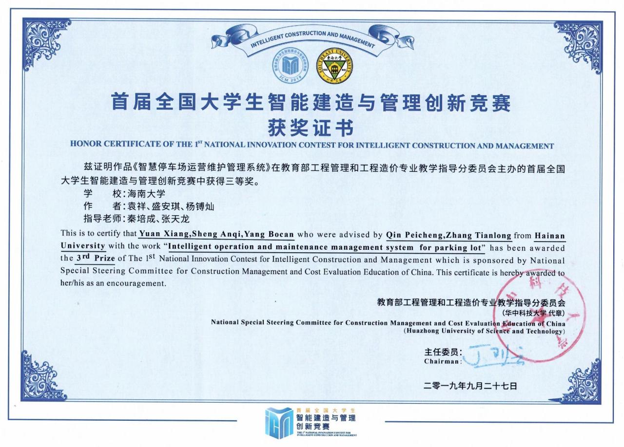 首届全国老员工智能建造与管理创新竞赛于2019年9月14日至9月15日在东南大学举办,公司和计算机与网络空间安全公司跨学科跨专业联合组队,经过提交作品、现场答辩和专家评审等环节代表队荣获三等奖。参赛员工队员分别为2016级工程管理专业袁祥、盛安琪同学及2016级计算机科学与技术专业杨镈灿同学,指导教师为db真人体育官网工程管理系秦培成老师和张天龙老师。