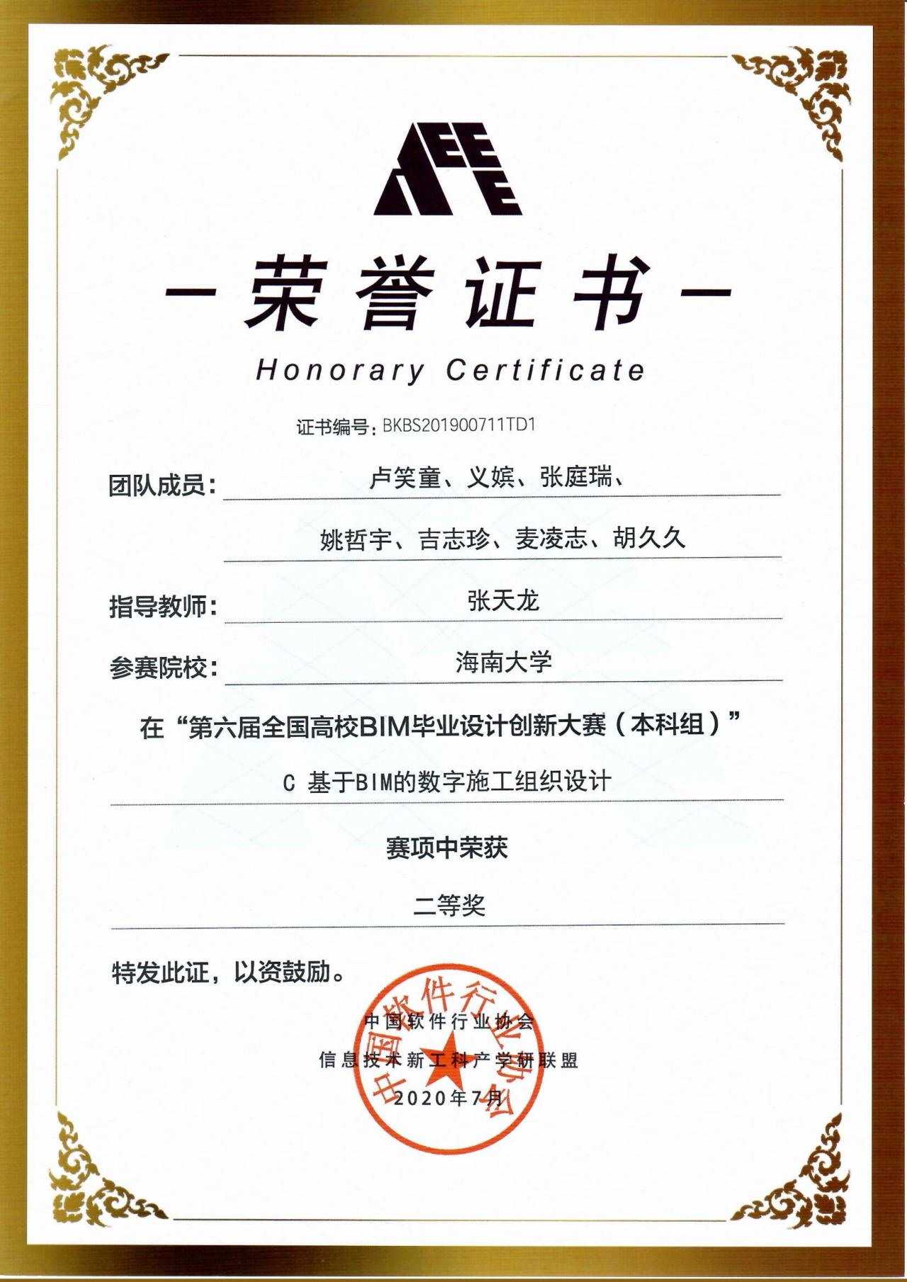 2020年6月16日,第六届全国高校BIM毕业设计创新大赛评选结果揭晓。由db真人体育官网工程管理系张天龙老师指导,工程管理2016级毕业生卢笑童、义嫔、张庭瑞、姚哲宇、吉志珍、胡久久、麦凌志、陈浩等组成的参赛团队在“基于BIM的数字施工组织设计”模块中斩获二等奖。