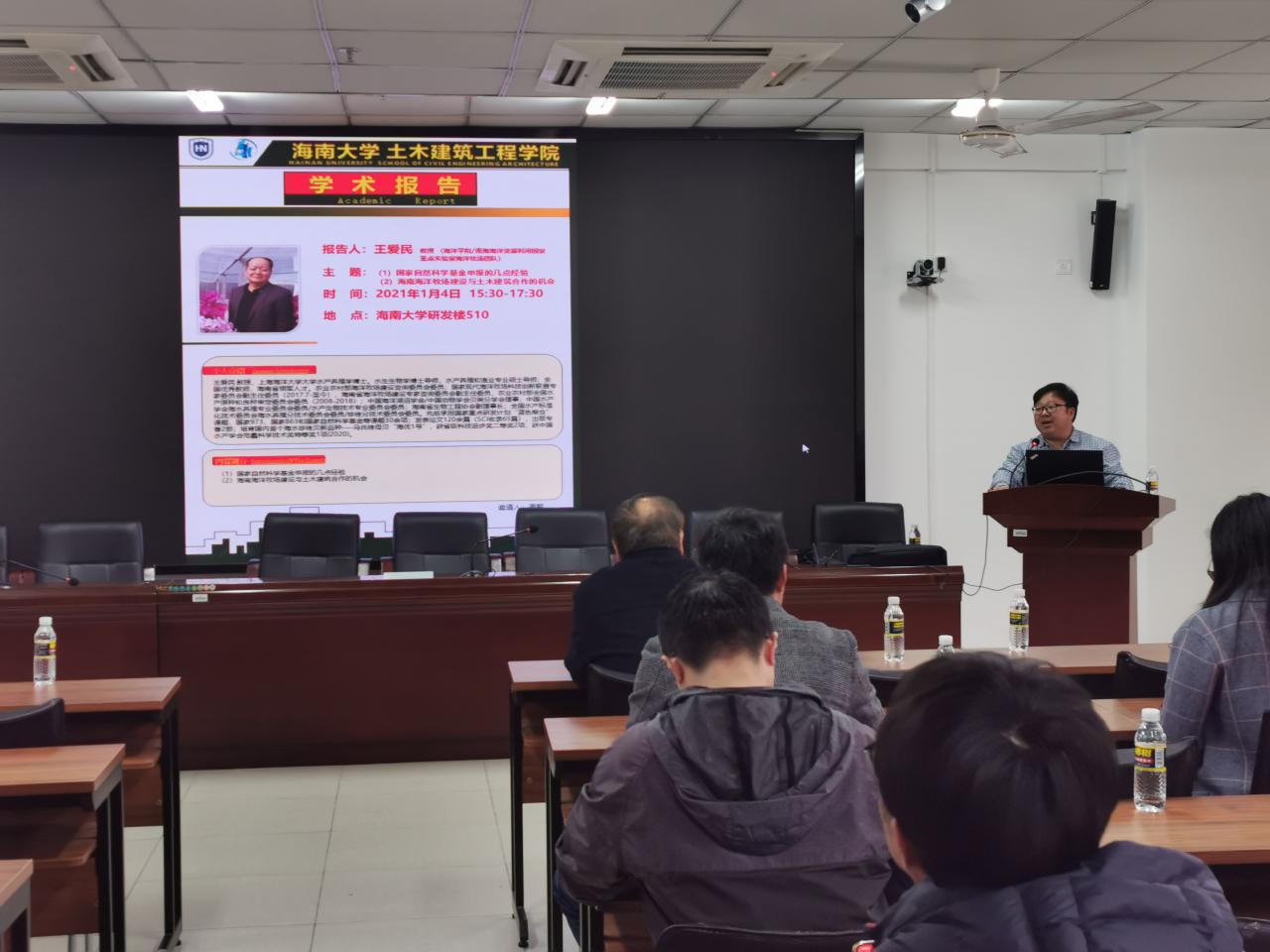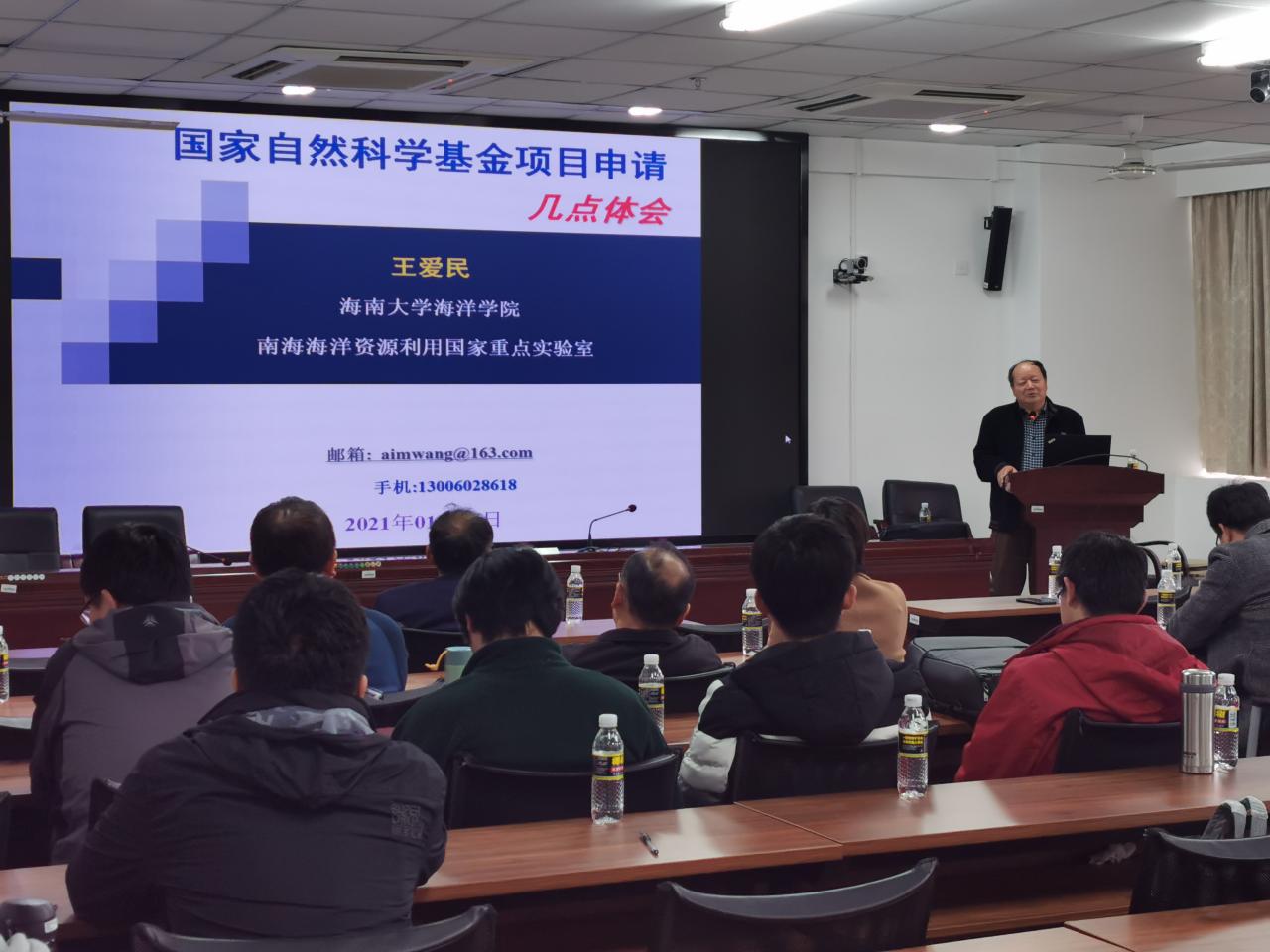 2021年1月4(周一)下午3:30-6:00点DB视讯海洋公司/南海海洋资源利用国家重点实验室海洋牧场团队负责人王爱民教授应公司周智经理的邀请,在研发楼510报告厅为公司拟申报2021年国家自然科学基金的老师做了题为《国家自然科学基金申报的几点体会》和《海南海洋牧场建设与土木建筑合作的机会》学术报告。报告会由周智经理主持,我院拟申报2021年国家自然科学基金的教师近30人参加了此次学术报告会。
