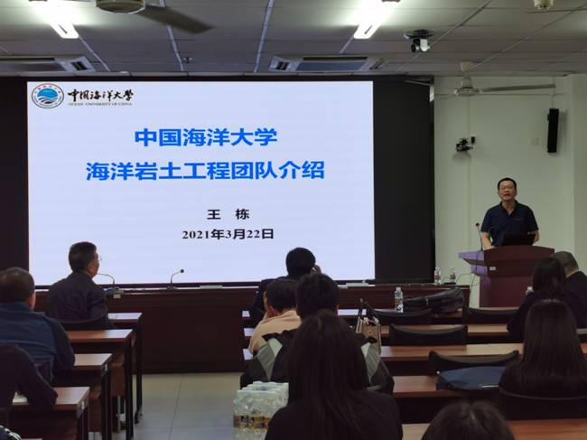 王栋教授作了题为“中国海洋大学海洋岩土工程研究”的报告,分别从团队简介、海底构筑物探测与监测、海岸侵蚀与防护、海洋岩土工程勘察与设计、推进中的工作等方面分享自己在研究海洋岩土工程方面的成果及科研心得。