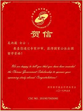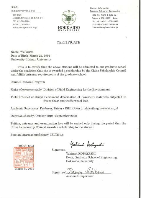 经过国家留学基金委(CSC)评审,2019年度国家公派研究生项目录取结果陆续公布。db真人体育官网硕士研究生吴雨薇成功获得国家留学基金委员会资助,将前往日本北海道大学攻读博士研究生学位,这是公司首次获得国家公派博士研究生项目资助,特此祝贺!