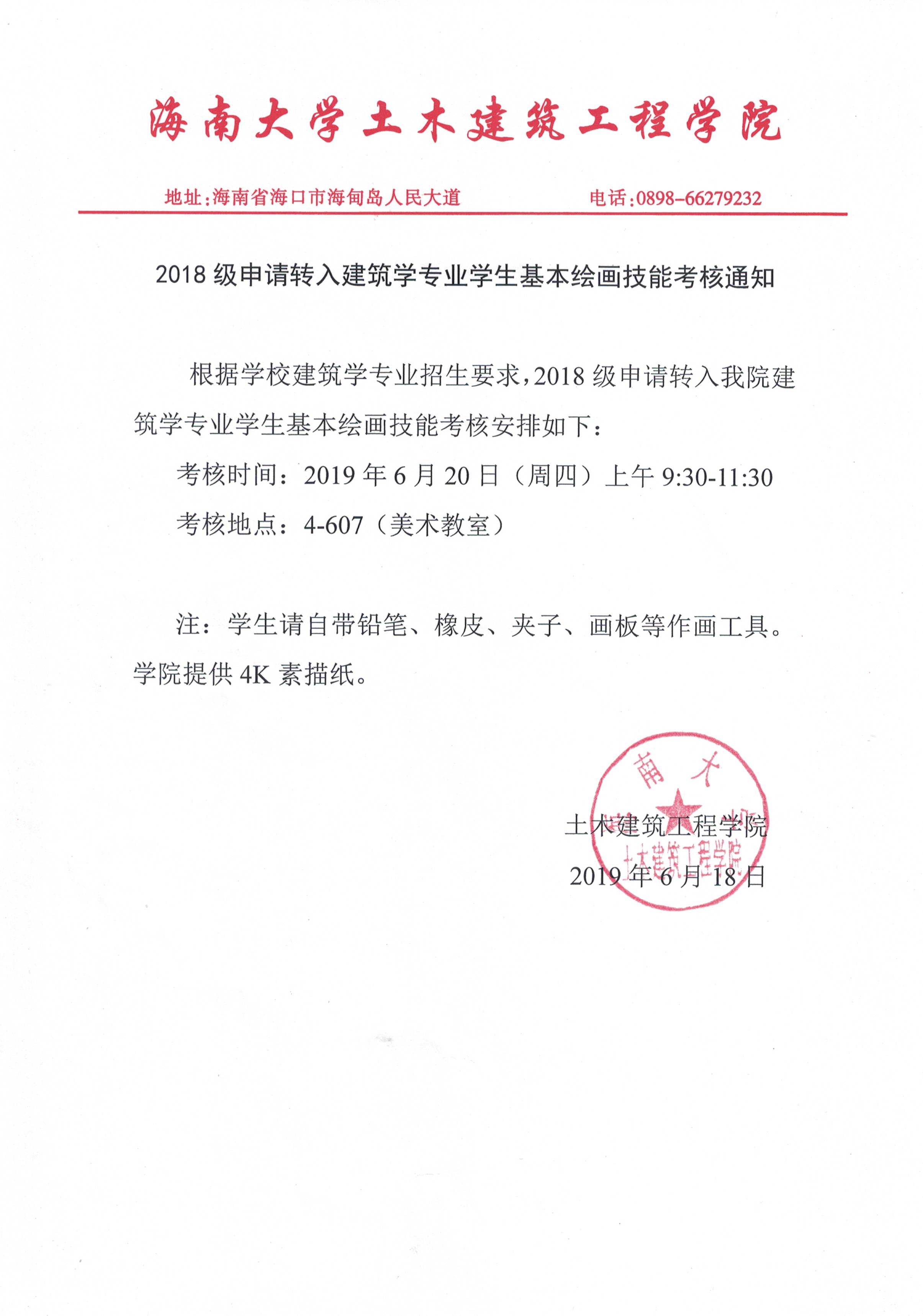 关于2018级员工转入建筑学专业基本绘画技能考核的安排