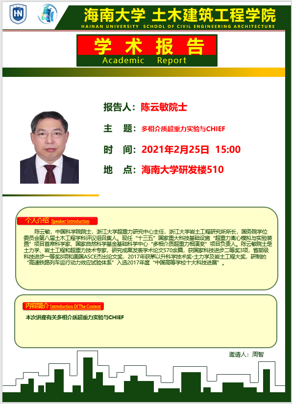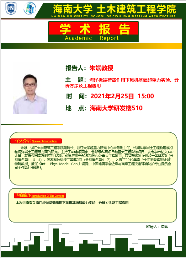 225日(周四)下午300点在DB视讯研发楼510,浙江大学陈云敏院士和朱斌教授分别在公司做《多相介质超重力实验与CHIEF》和《海洋极端荷载作用下风机基础超重力实验、分析方法及工程应用》学术报告。请各位老师和在校研究生务必参加,到时会做参会签名,考勤记录。