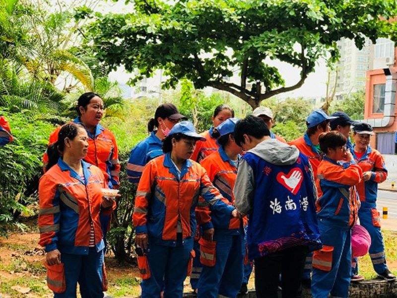 各志愿者小组按照约定时间到达集合地点,志愿者领队陈博文、曹志远同学向环卫工人负责人了解了他们日常工作负责的区域、工作的基本要求以及注意事项,并对志愿者本次活动要完成的任务做了简单的布置和安排。随后,志愿者们按照事先分配好的小组和任务开始和环卫工人一起工作。因天气炎热,志愿者还事先准备了解暑的绿豆汤送到环卫工人手中,感谢他们为这个城市付出的辛勤劳动。
