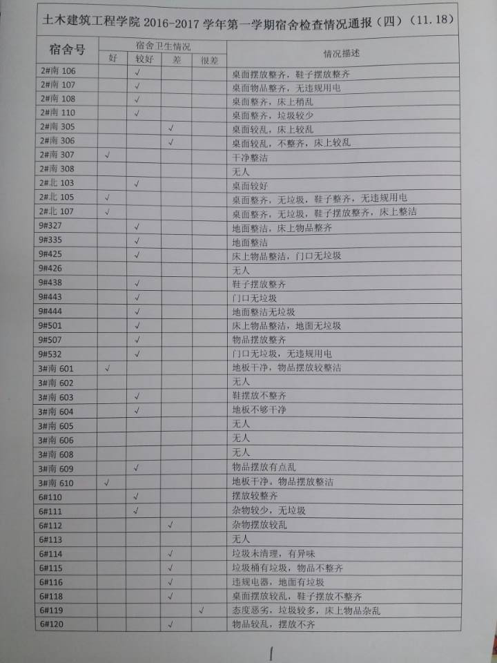 2016-2017学年第一学期宿舍检查情况通报(四)