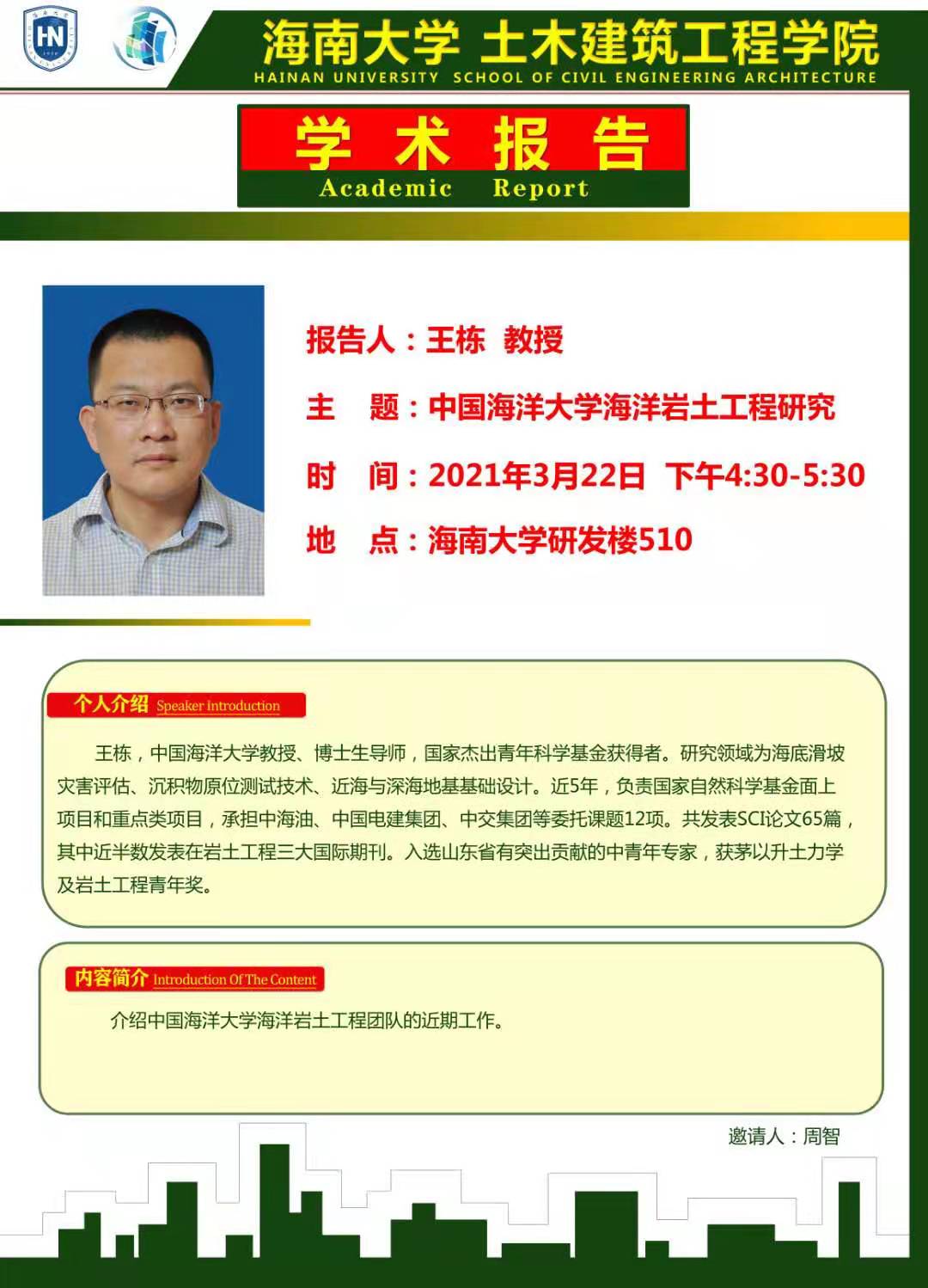 3月22日(周一)下午4:00-5:30点在DB视讯研发楼510,中国科公司武汉岩土力学研究所,博士生导师汪稔研究员和中国海洋大学王栋教授分别在公司做题为《岛礁建设对“一带一路”倡议的贡献》和《中国海洋大学海洋岩土工程研究》。请有兴趣的老师和没有课的研究生务必参加,到时会做参会签名,考勤记录。特此通知 学科与科研办 2021年 3月21日