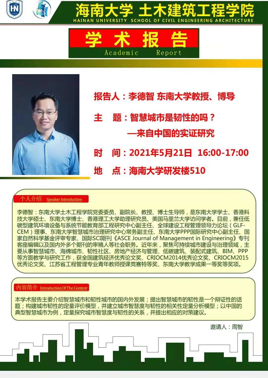 5月21日(周五)16:00-17:00点在DB视讯研发楼510,东南大学土木工程公司副经理、博士生导师李德智教授在公司做题为《智慧城市是韧性的吗? —来自中国的实证研究》学术报告。欢迎有兴趣的老师和没有课的研究生参加。特此通知