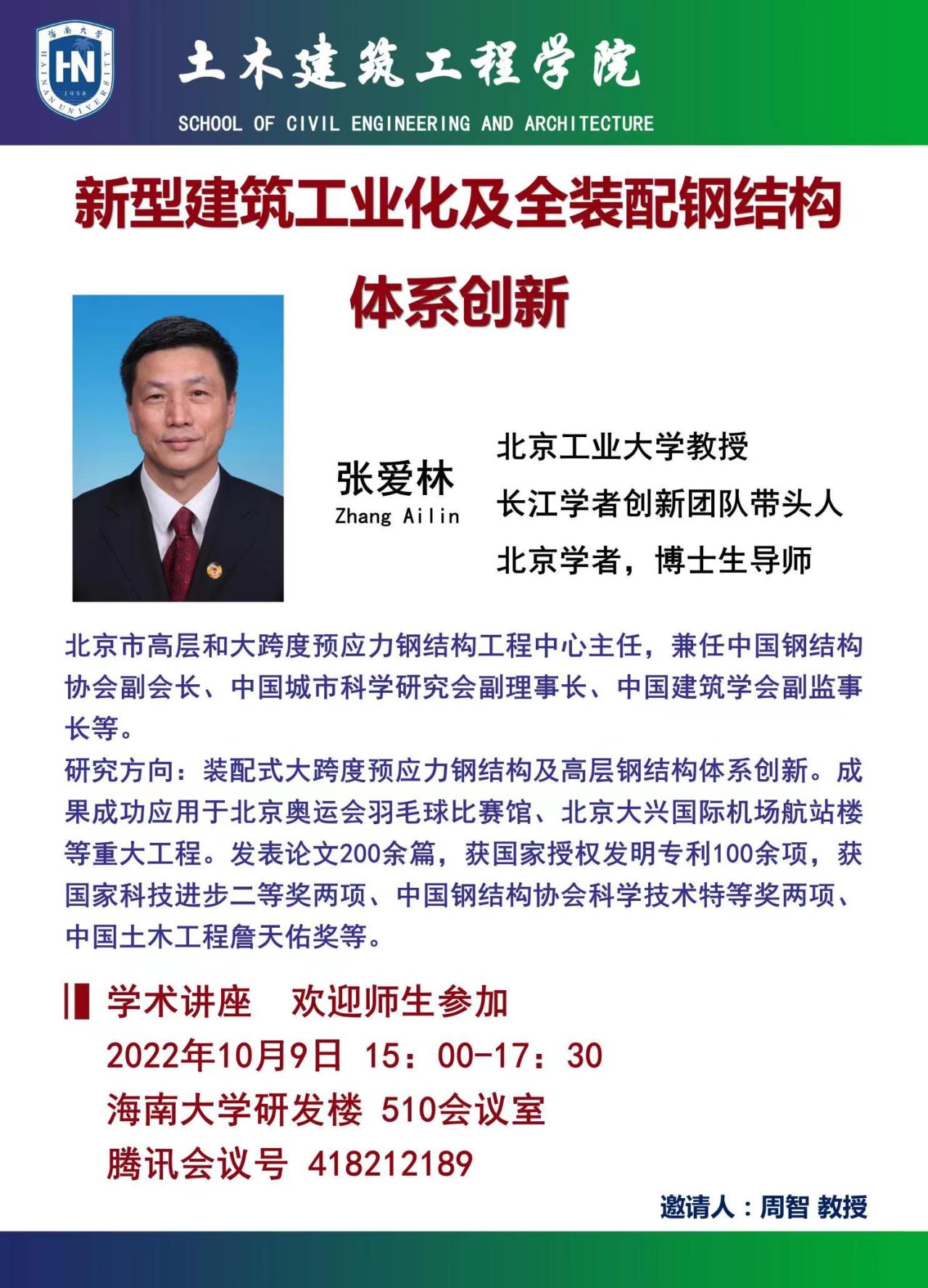 10月9日(周日)下15:00-17:30 点在DB视讯研发楼510,北京工业大学张爱林 教授在公司做《新型建筑工业化及全装配钢结构体系创新》学术报告。请有兴趣的老师和研究生通过线上同步方式参加。