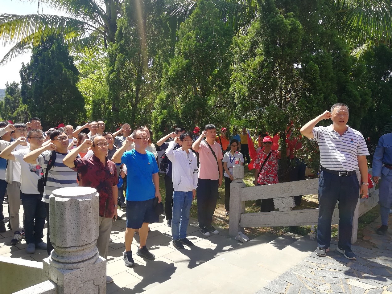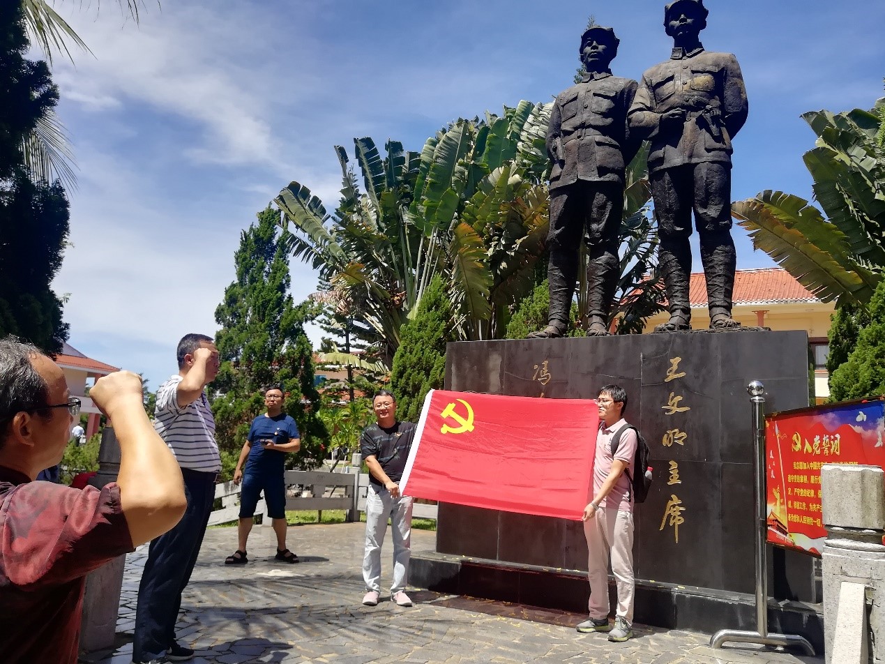 “我志愿加入中国共产党,拥护党的纲领,遵守党的章程……”在琼崖革命主要领导人王文明和冯白驹的雕像下,两个教工支部党员在公司党委卢江海书记的带领下重温入党誓词。